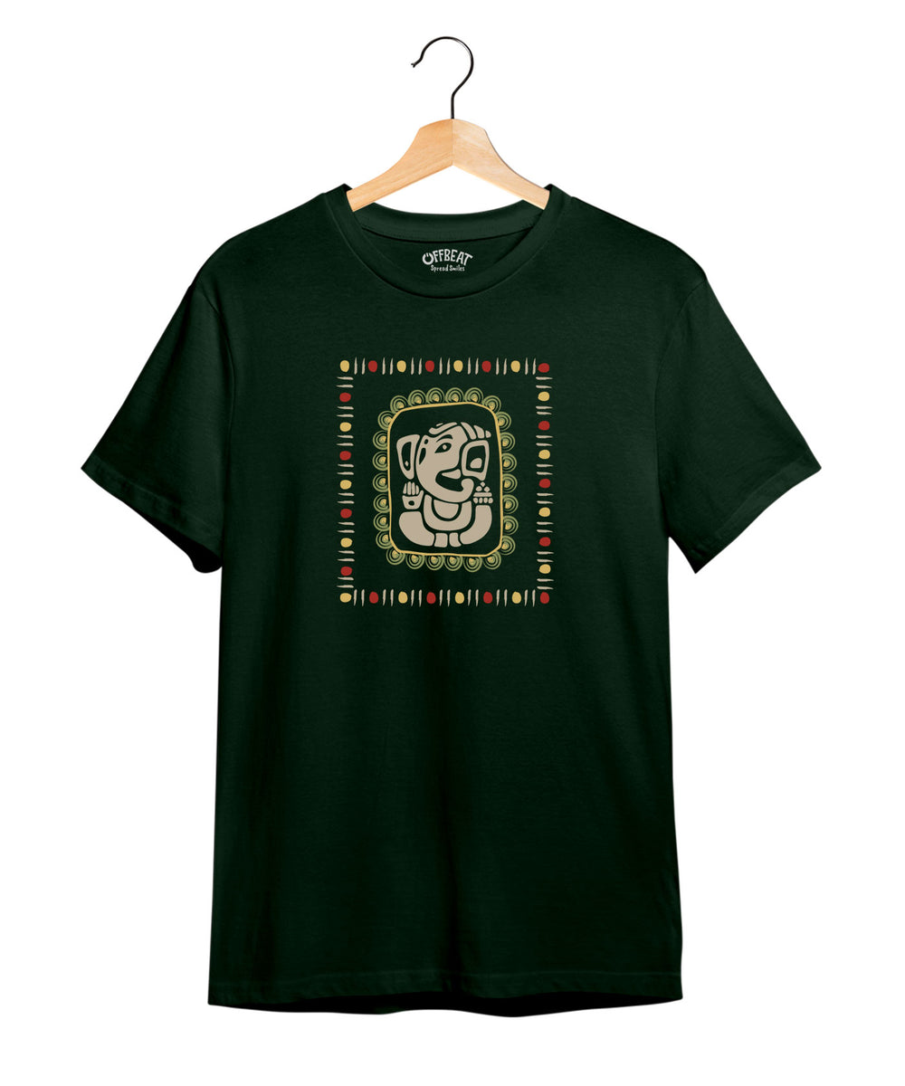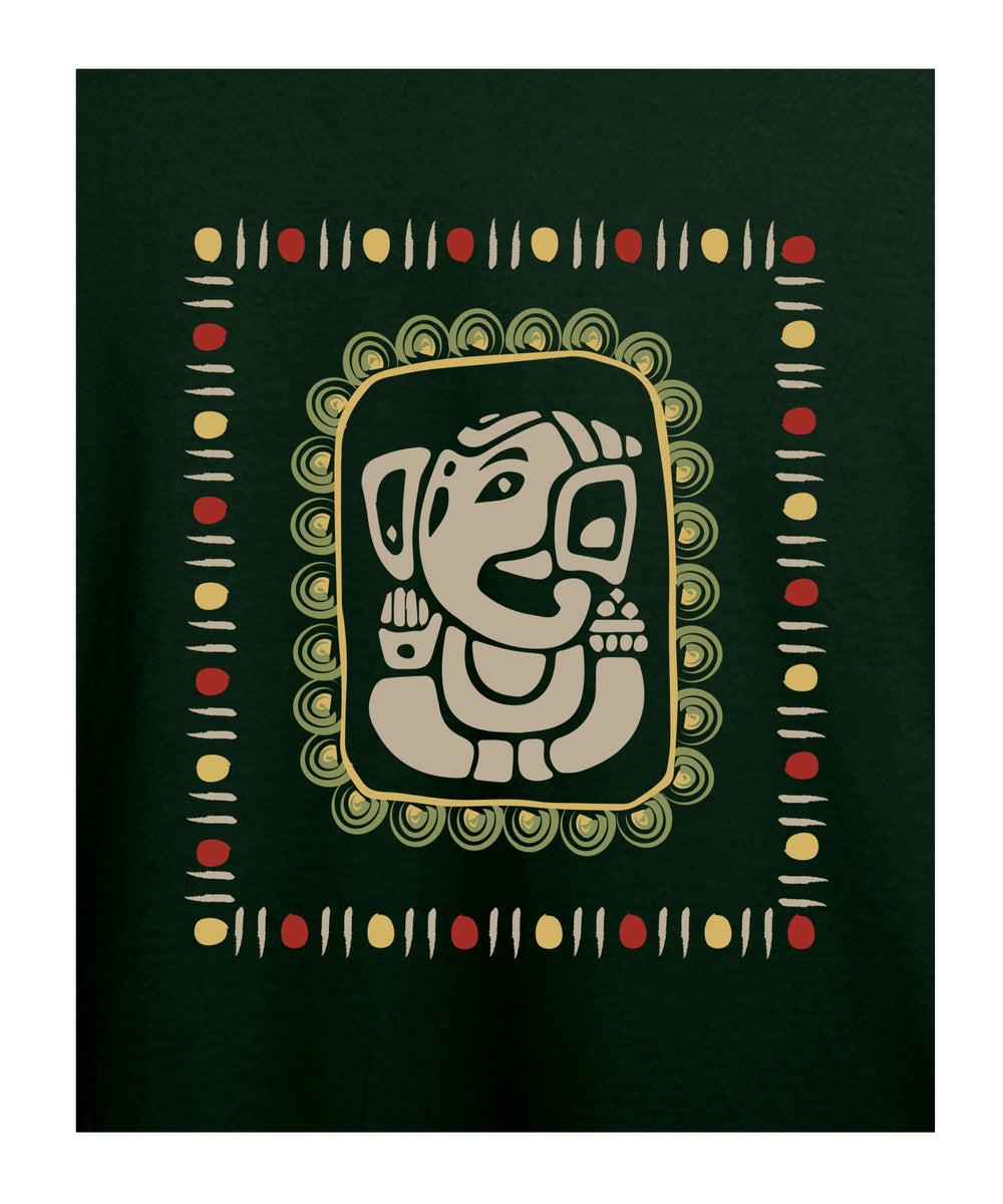 Honor tradition with a modern twist. The Gaj Ganesha tee features Lord Ganesha in an artistic form, printed on a rich bottle green cotton base.